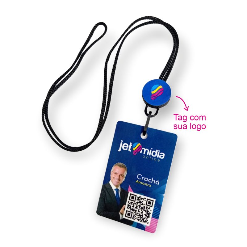 O cordão = Fit nylon de 5mm de espessura com tag personalizada com sua logo, tamanho padrão para ser usado no pescoço com acabamento em plástico ecológico resistente na cor combinando com a identidade da sua logo.