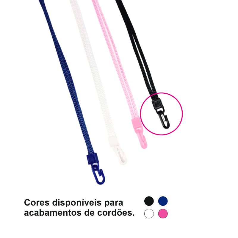 O cordão = Fit nylon de 5mm de espessura com tag personalizada com sua logo, tamanho padrão para ser usado no pescoço com acabamento em plástico ecológico resistente na cor combinando com a identidade da sua logo.